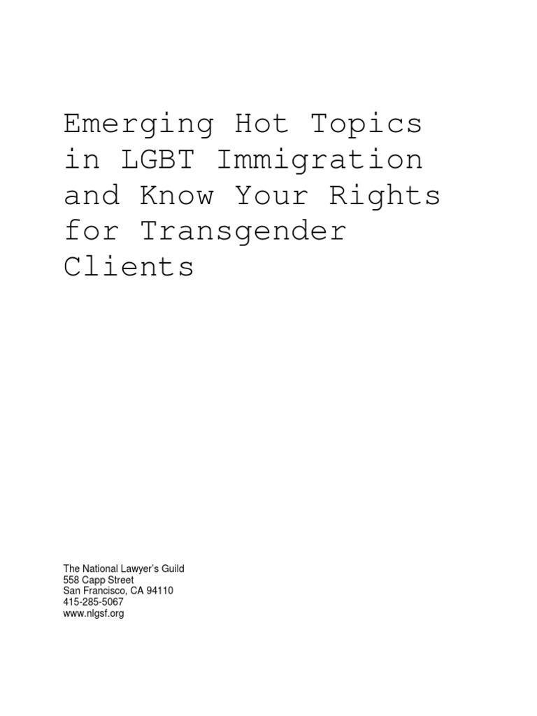 making justice more accessible. You may be eligible for pro bono (free of charge) representation or fee structures that work for you (such as contingency fees, where you only pay if you win your case). Additionally, many attorneys are happy to meet with potential clients for free to assess your case. This can be a good way to learn more about your options and whether it's worth it to you to pursue specific legal actions. A NOTE TO PROFESSIONALS This manual was designed to be a resource to clients, but it is our hope that service providers and legal professionals will also find it useful. Attorneys may find this manual to be a helpful starting point for legal research and a useful tool for locating additional resources. All manuals in this series contain footnotes to case law, law review articles, and statutes that we hope will assist you. As with any compilation of research, attorneys are urged to check all cited law before relying on it to make sure there haven't been substantive changes and that it will apply to your client's particular case. Many of the organizations listed in the resource section of this document provide assistance to attorneys representing clients, and can be excellent sources for information and insight. When advocating for transgender clients, attorneys can advocate for the use of appropriate name and pronoun for their client in court and other proceedings. BASIC RIGHTS Both citizens and non-citizens alike have rights under the United States Constitution. The Fifth Amendment gives every person the right to remain silent that is, to not answer questions asked by a police officer or government agent. The Fourth Amendment restricts the governments power to enter and search a person's home or workplace, although there are many exceptions and new laws have expanded the governments power to conduct surveillance, as well as the authority for the police to search a person or belongings. The First Amendment protects a person's right to speak freely and to advocate for social change. However, the Department of Homeland Security (DHS) can legally target someone based on political activities if that person is a non-citizen and can be deported. These Constitutional rights are absolute, and cannot be suspended even during wartime.1 GETTING STARTED: A NOTABLE TRANSGENDER IMMIGRATION LAW RESOURCE Because transgender individuals with immigration concerns are doubly vulnerable to unjust actions by police and Immigration authorities, there is a strong network of support for transgender community members dealing with immigration issues. This manual aims to be a general and broad resource to answer common and locally-specific questions, but there are many resources on the internet that are also very thorough and helpful. One notable resource is a project from Immigration Equality a national organization, the Transgender Law Center, an organization based in San Francisco, and published by the American Immigration Lawyer's Association. This resource, Immigration Law and the Transgender Client is a large and thorough manual that provides in-depth information about a large scope of transgender-specific concerns. It is available for sale at
