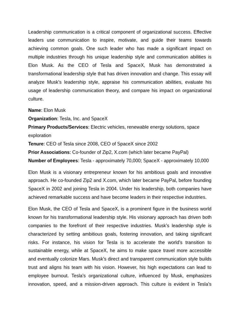 analyze Musk’s leadership style, appraise his communication abilities, evaluate his