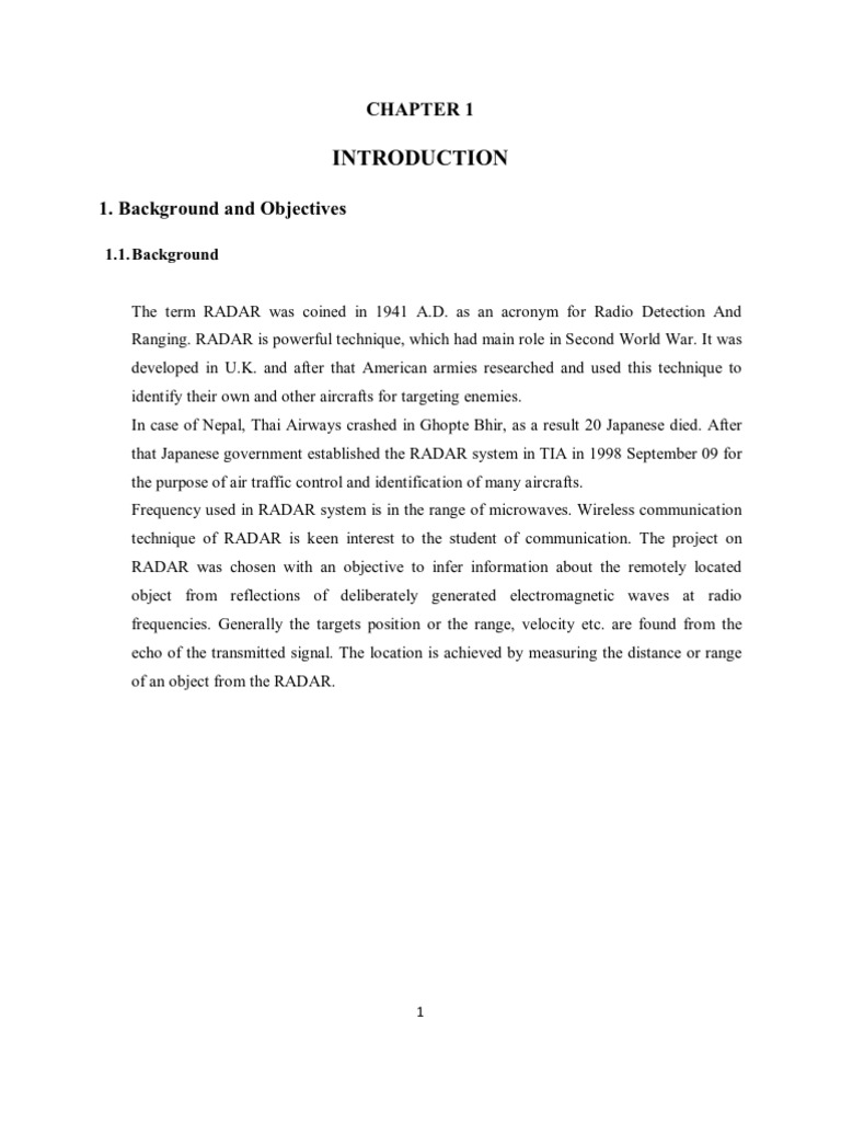 The term RADAR was coined in 1941 A.D. as an acronym for Radio Detection And Ranging. RADAR is powerful technique, which had main role in Second World War. It was developed in U.K. and after that American armies researched and used this technique to identify their own and other aircrafts for targeting enemies. In case of Nepal, Thai Airways crashed in Ghopte Bhir, as a result 20 Japanese died. After that Japanese government established the RADAR system in TIA in 1998 September 09 for the purpose of air traffic control and identification of many aircrafts. Frequency used in RADAR system is in the range of microwaves. Wireless communication technique of RADAR is keen interest to the student of communication. The project on RADAR was chosen with an objective to infer information about the remotely located object from reflections of deliberately generated electromagnetic waves at radio frequencies. Generally the targets position or the range, velocity etc. are found from the echo of the transmitted signal. The location is achieved by measuring the distance or range of an object from the RADAR.