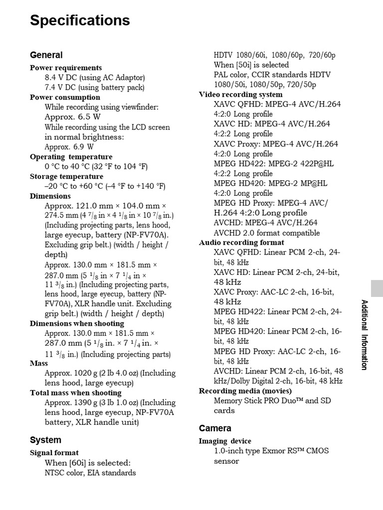 287.0 mm (5 1/8 in × 7 1/4 in × XAVC HD: Linear PCM 2-ch, 24-bit,