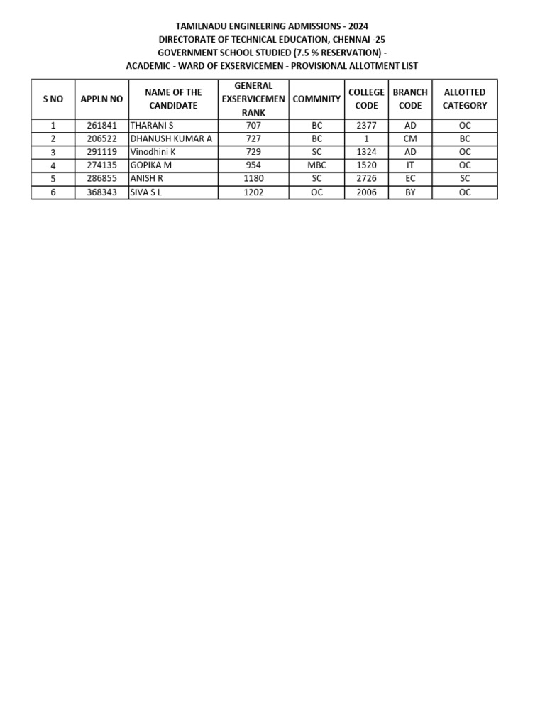 ACADEMIC - WARD OF EXSERVICEMEN - PROVISIONAL ALLOTMENT LIST