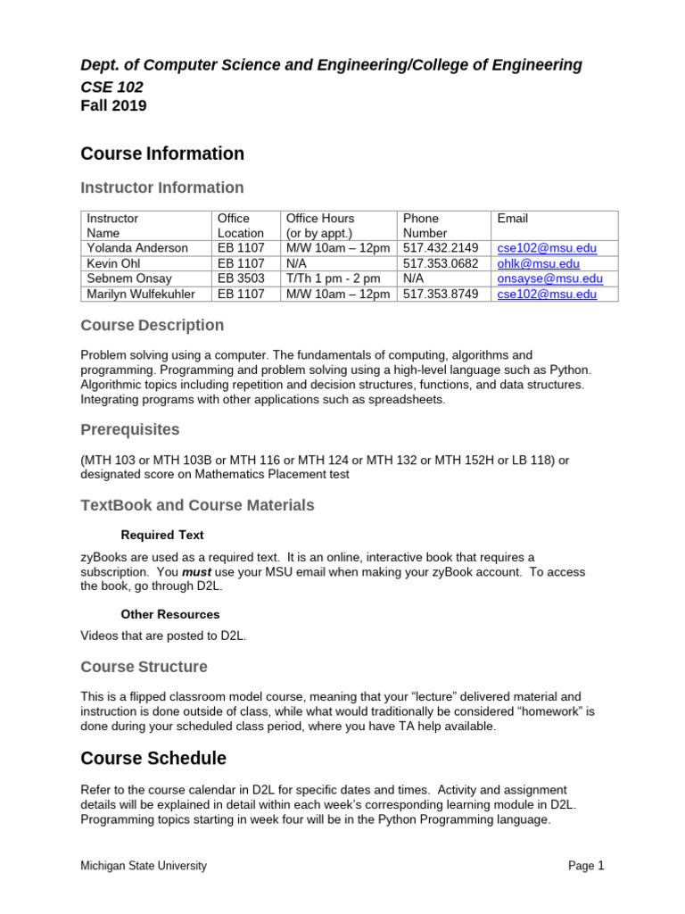 Yolanda Anderson EB 1107 M/W 10am – 12pm 517.432.2149 cse102@msu.edu