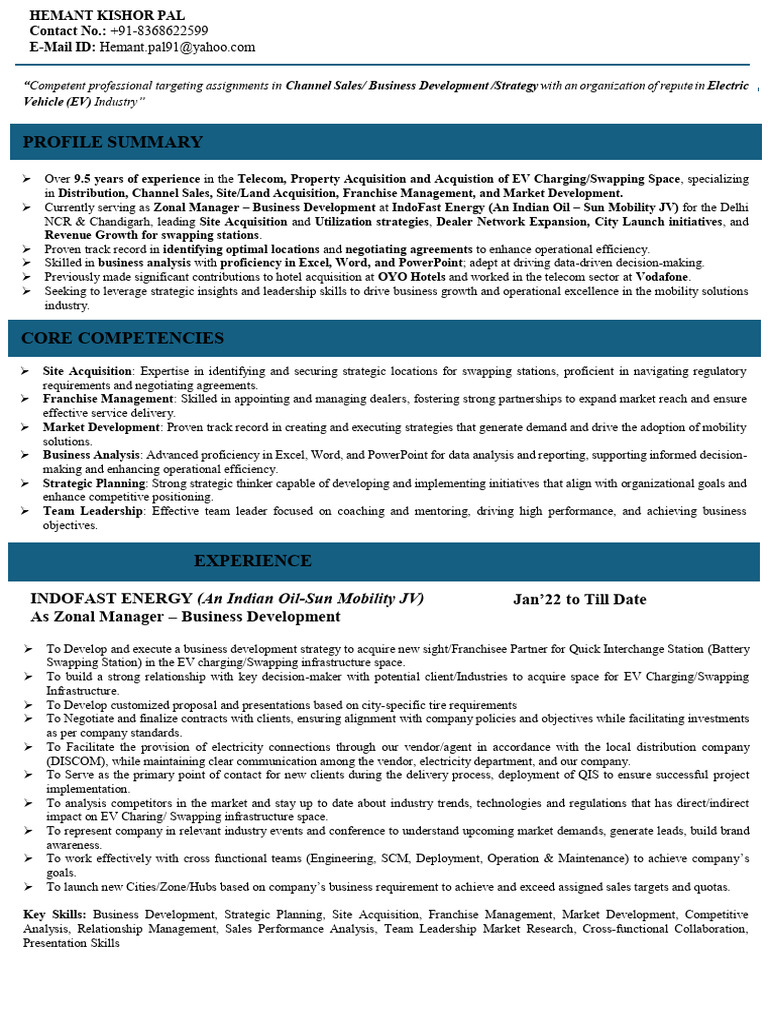 Currently serving as Zonal Manager – Business Development at IndoFast Energy (An Indian Oil – Sun Mobility JV) for the Delhi