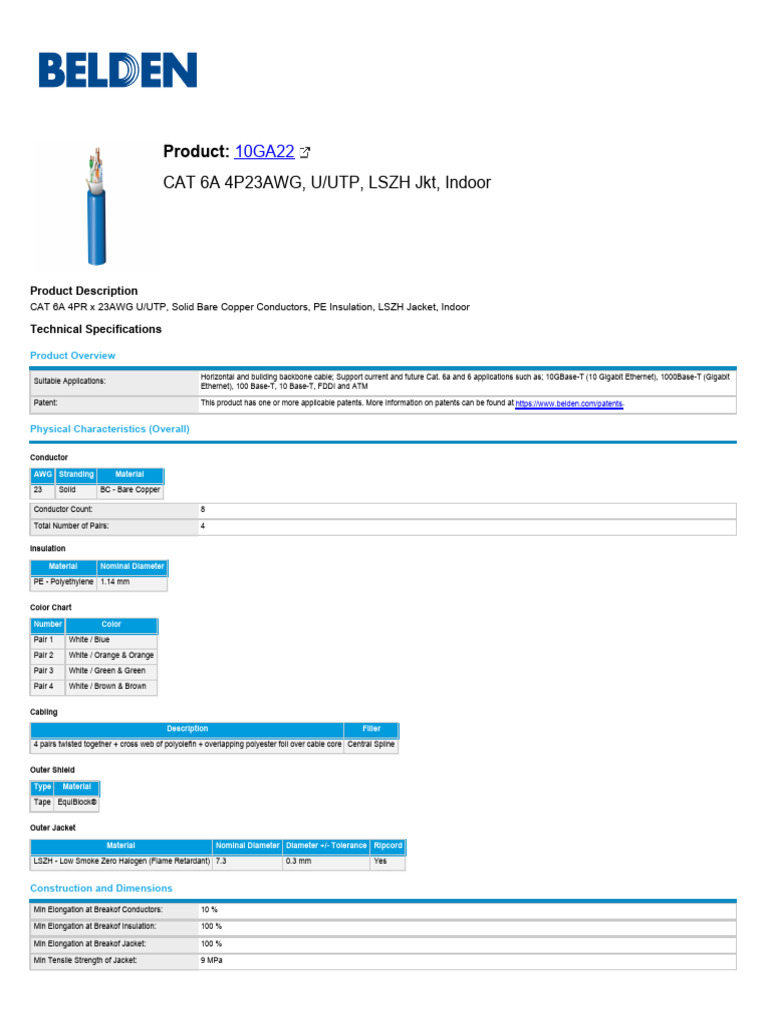Horizontal and building backbone cable; Support current and future Cat. 6a and 6 applications such as; 10GBase-T (10 Gigabit Ethernet), 1000Base-T (Gigabit