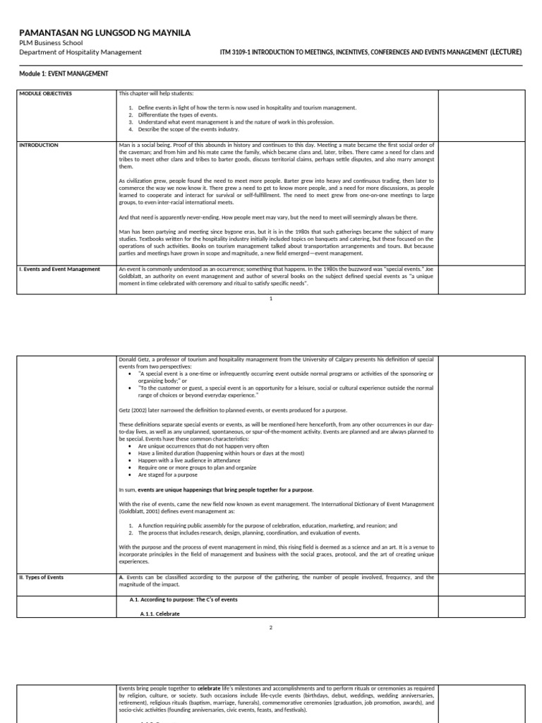 Department of Hospitality Management ITM 3109-1 INTRODUCTION TO MEETINGS, INCENTIVES, CONFERENCES AND EVENTS MANAGEMENT (LECTURE)