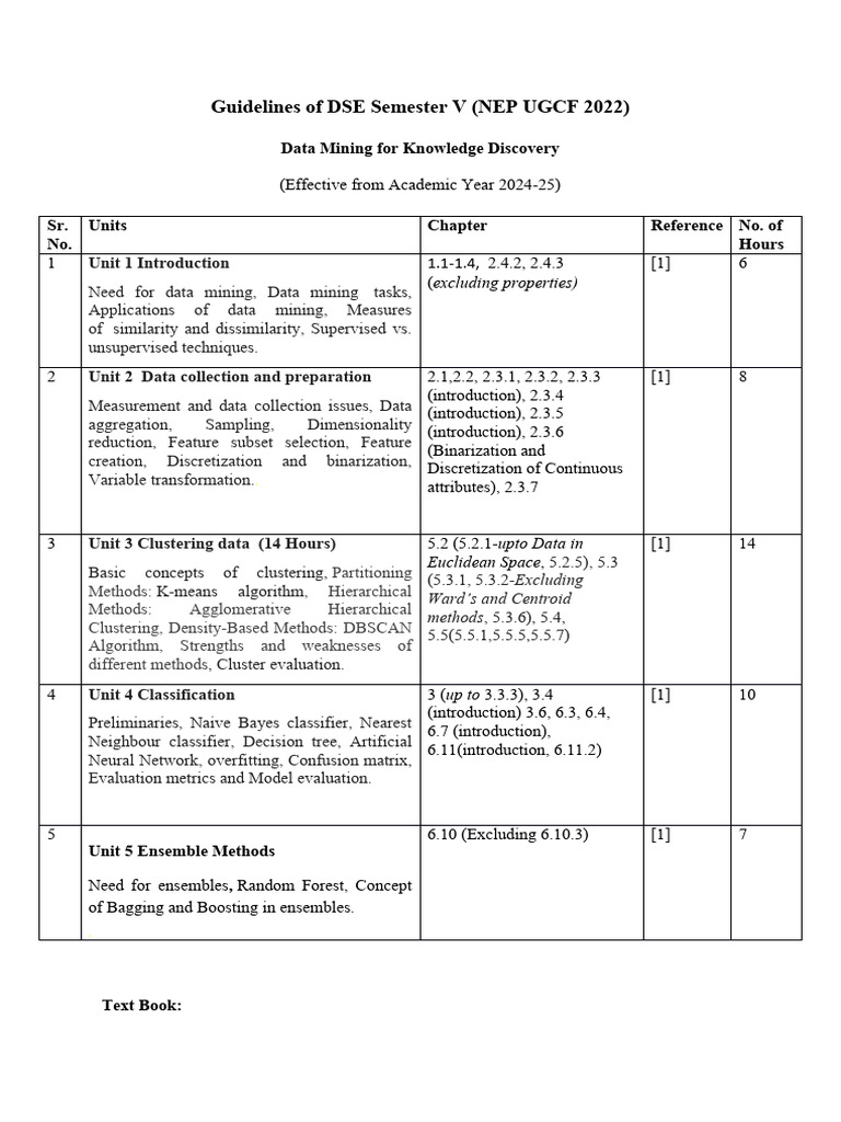 1. Tan P.N., Steinbach M, Karpatne A. and Kumar V. Introduction to Data Mining,
