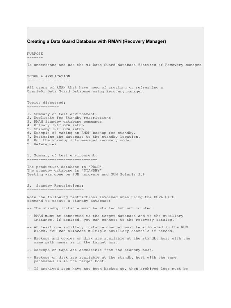 PURPOSE ------To understand and use the 9i Data Guard database features of Recovery manager SCOPE & APPLICATION ------------------All users of RMAN that have need of creating or refreshing a Oracle9i Data Guard Database using Recovery manager. Topics discussed: ============== 1. 2. 3. 4. 5. 6. 7. 8. 9. Summary of test environment. Duplicate for Standby restrictions. RMAN Standby database commands. Primary INIT.ORA setup Standby INIT.ORA setup Example of making an RMAN backup for standby. Restoring the database to the standby location. Put the standby into managed recovery mode. References