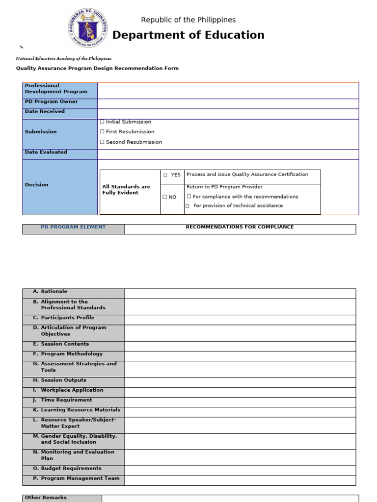 Quality Assurance Program Design Recommendation Form