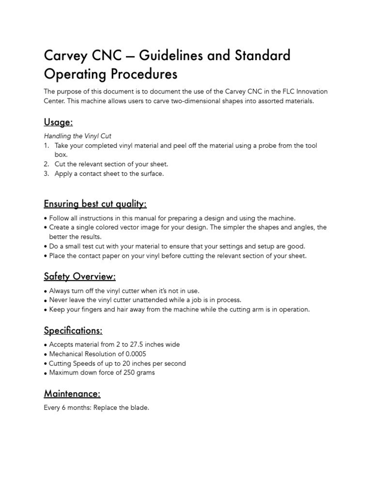 The purpose of this document is to document the use of the Carvey CNC in the FLC Innovation