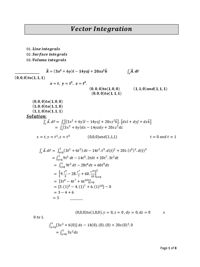 𝑧 = 𝑡, then, ∫𝑐 𝐴̅. 𝑑𝑟̅ = ∫𝑡=0(3𝑡 2 + 6𝑡) 𝑑𝑡 − 14(𝑡). (𝑡). 𝑑𝑡 + 20𝑡. (𝑡)2 . 𝑑𝑡