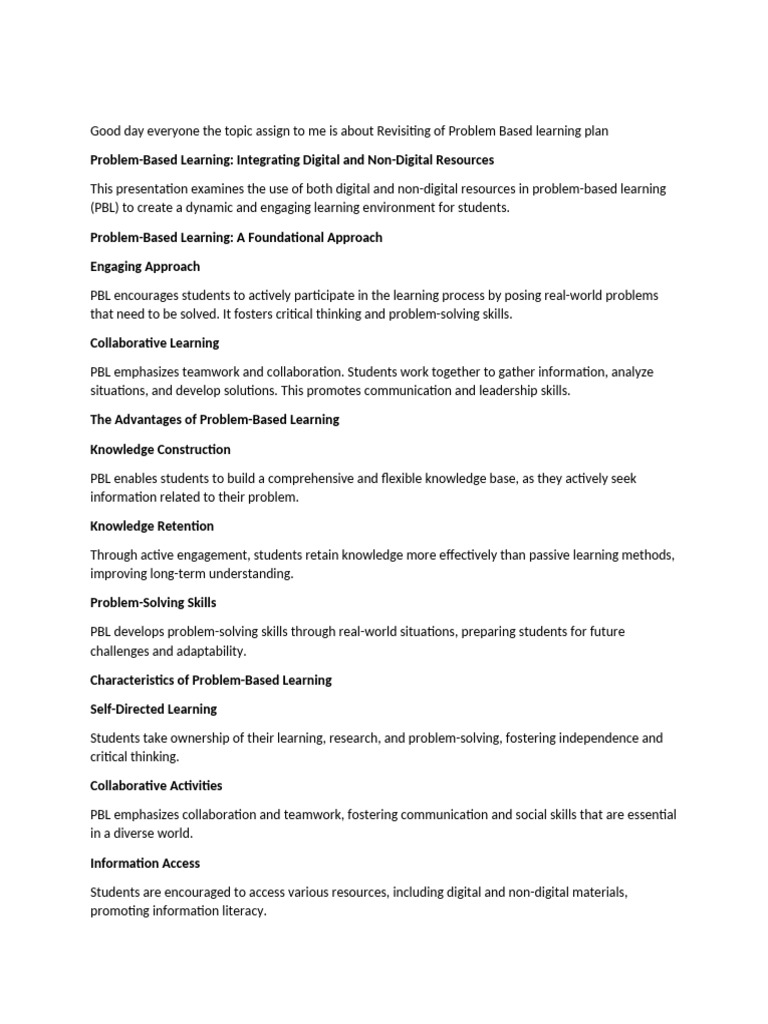 Good day everyone the topic assign to me is about Revisiting of Problem Based learning plan