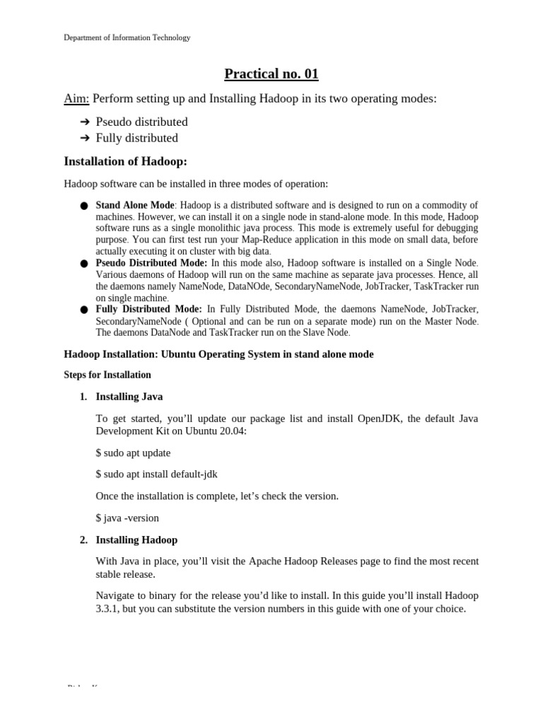 Aim: Perform setting up and Installing Hadoop in its two operating modes: