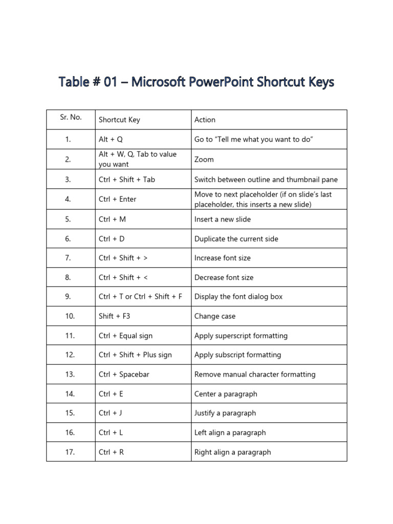 21. Alt + Shift + Down arrow Move selected outline paragraphs down
