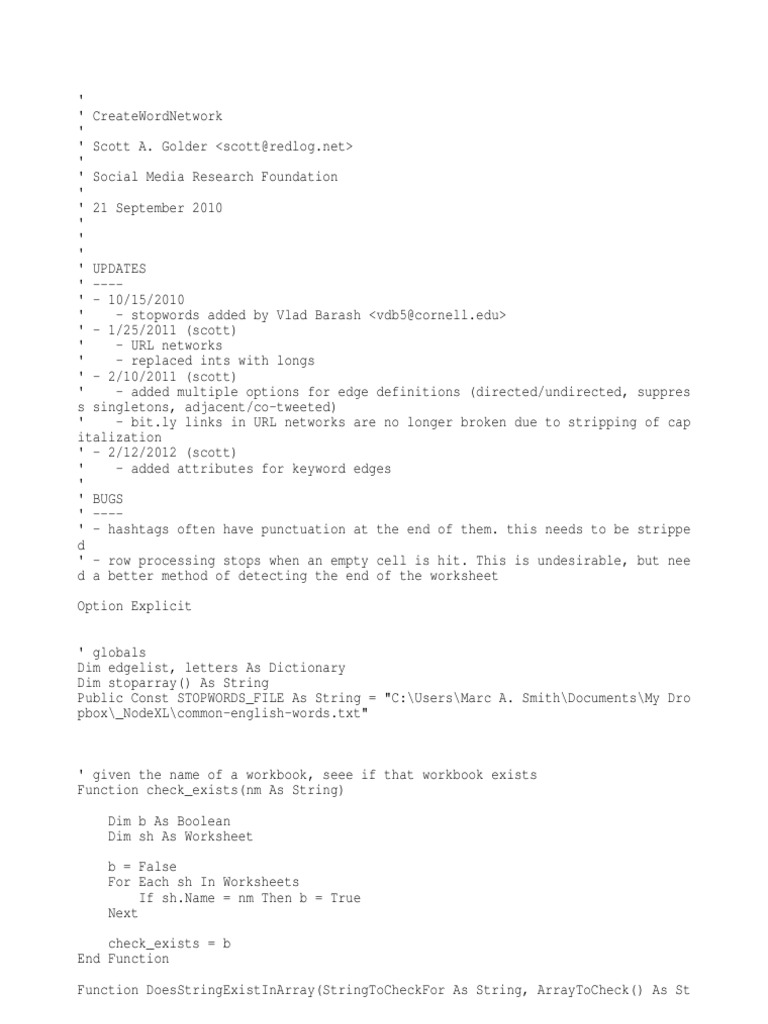 net> ' ' Social Media Research Foundation ' ' 21 September 2010 ' ' ' ' UPDATES ' ---' - 10/15/2010 ' - stopwords added by Vlad Barash <vdb5@cornell.edu> ' - 1/25/2011 (scott) ' - URL networks ' - replaced ints with longs ' - 2/10/2011 (scott) ' - added multiple options for edge definitions (directed/undirected, suppres s singletons, adjacent/co-tweeted) ' - bit.ly links in URL networks are no longer broken due to stripping of cap italization ' - 2/12/2012 (scott) ' - added attributes for keyword edges ' ' BUGS ' ---' - hashtags often have punctuation at the end of them. this needs to be strippe d ' - row processing stops when an empty cell is hit. This is undesirable, but nee d a better method of detecting the end of the worksheet Option Explicit ' globals Dim edgelist, letters As Dictionary Dim stoparray() As String Public Const STOPWORDS_FILE As String = "C:\Users\Marc A. Smith\Documents\My Dro pbox\_NodeXL\common-english-words.txt"