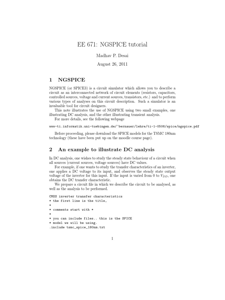 NGSPICE (or SPICE3) is a circuit simulator which allows you to describe a circuit as an interconnected network of circuit elements (resistors, capacitors, controlled sources, voltage and current sources, transistors, etc.) and to perform various types of analyses on this circuit description. Such a simulator is an invaluable tool for circuit designers. This note illustrates the use of NGSPICE using two small examples, one illustrating DC analysis, and the other illustrating transient analysis. For more details, see the following webpage www-ti.informatik.uni-tuebingen.de/~bernauer/lehre/ti-1-0506/spice/ngspice.pdf Before proceeding, please download the SPICE models for the TSMC 180nm technology (these have been put up on the moodle course page).