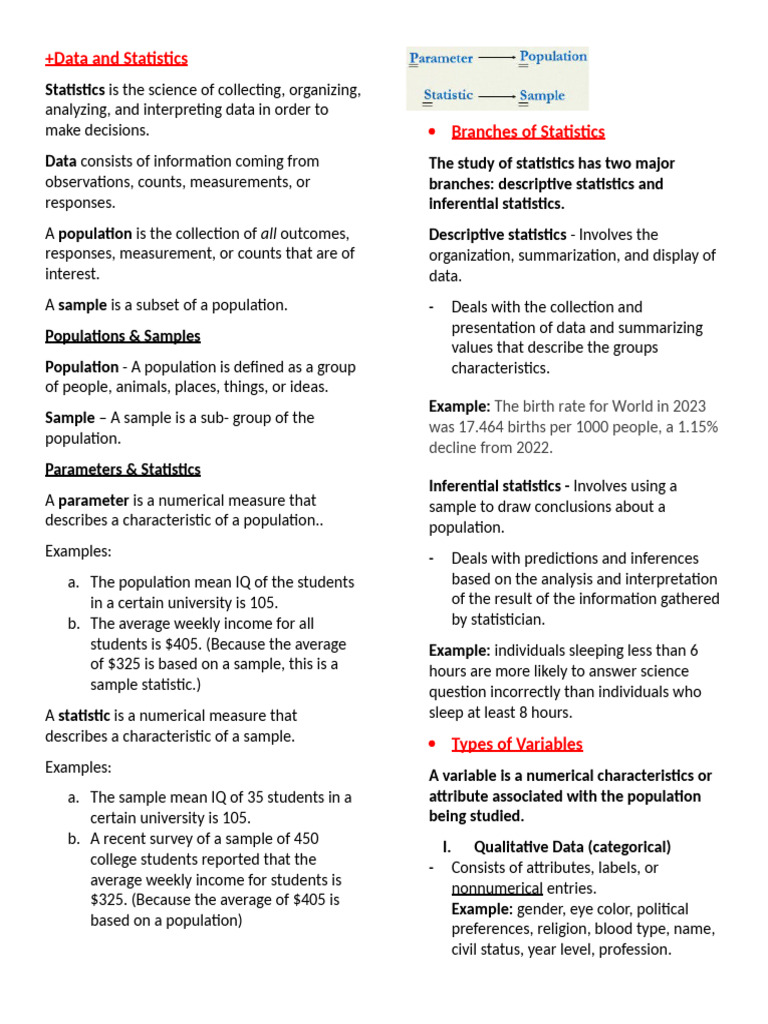 A population is the collection of all outcomes, Descriptive statistics - Involves the