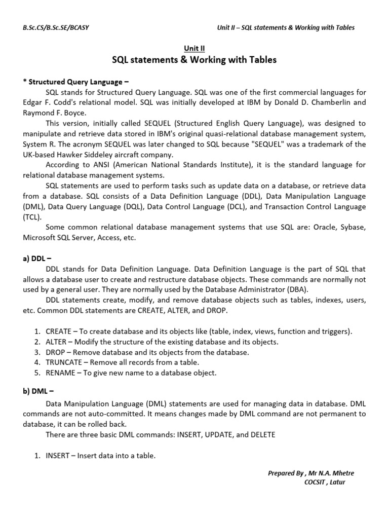 B.Sc.CS/B.Sc.SE/BCASY Unit II – SQL statements & Working with Tables