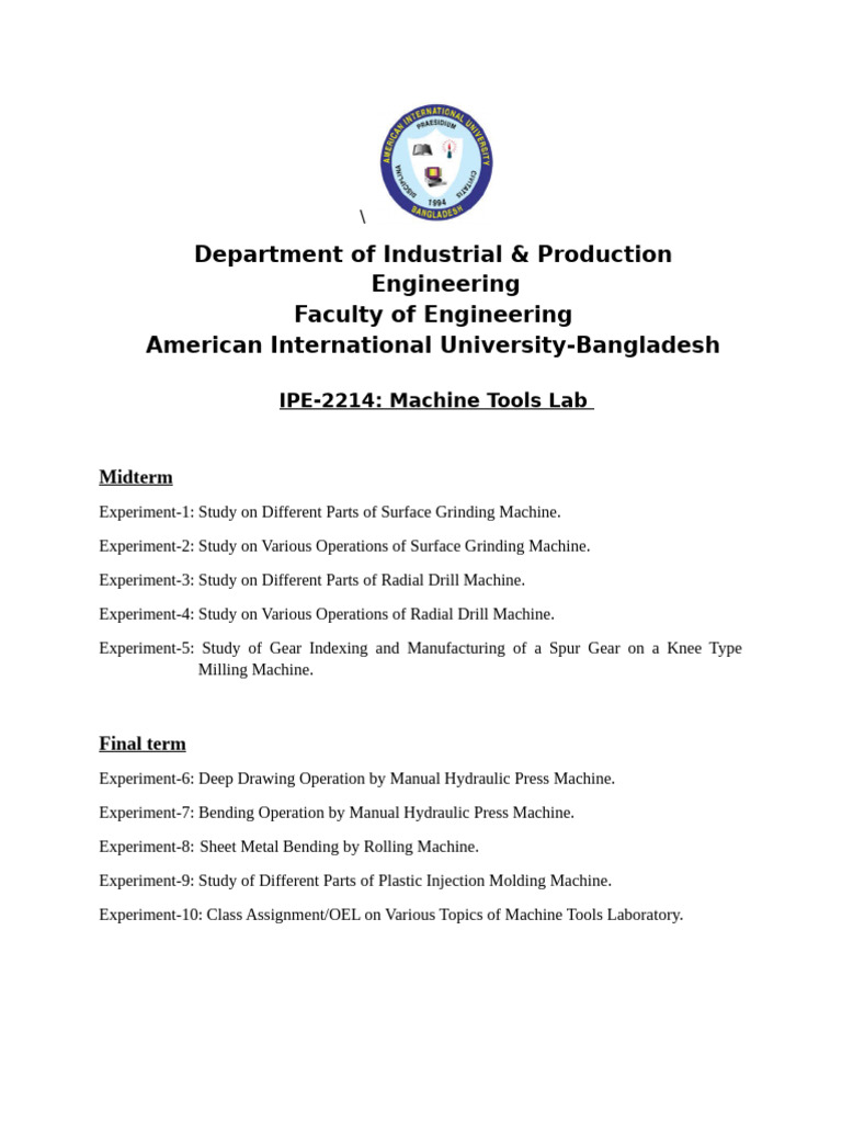 Experiment-10: Class Assignment/OEL on Various Topics of Machine Tools Laboratory.