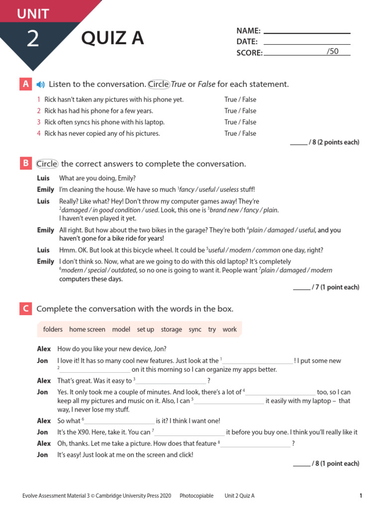 Evolve Assessment Material 3 © Cambridge University Press 2020 Photocopiable Unit 2 Quiz A 1