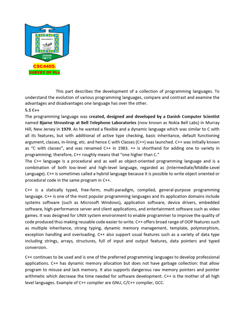 CSC4405: EVOLUTION OF SELECTED PROGRAMMING LANGUAGES