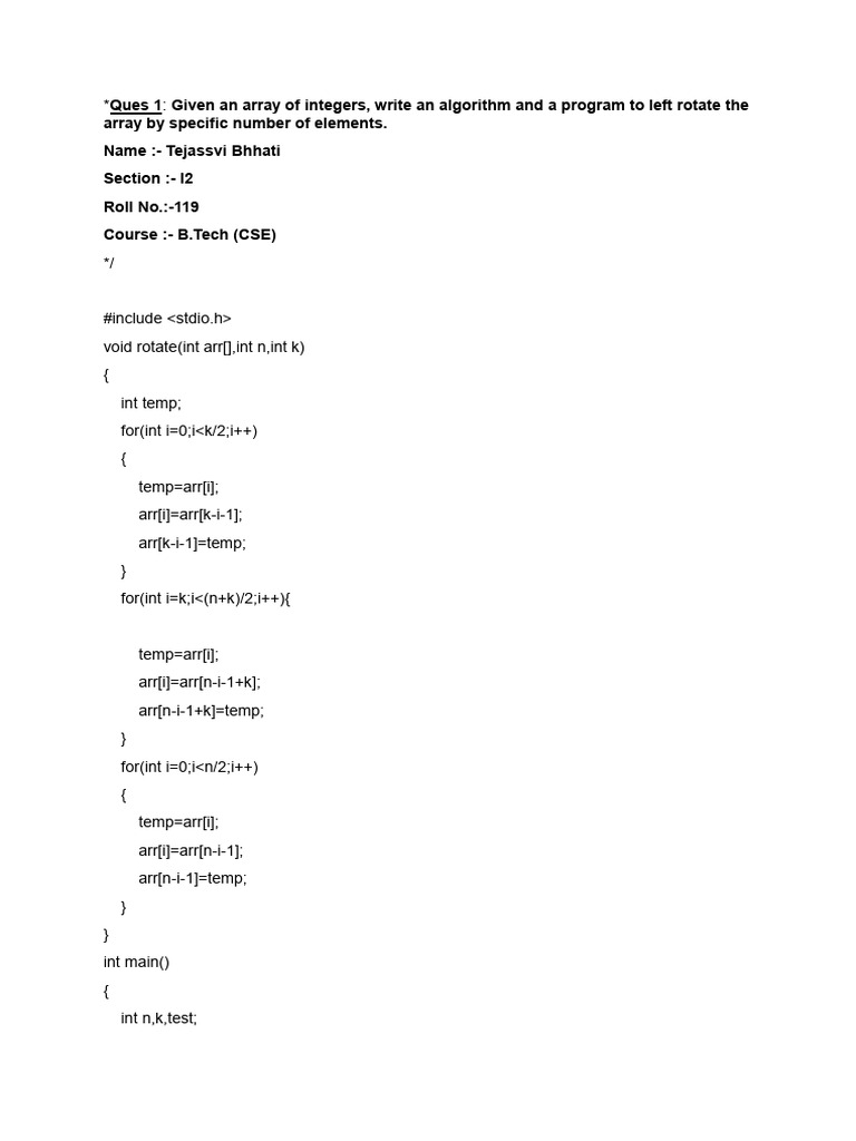 *Ques 1: Given an array of integers, write an algorithm and a program to left rotate the