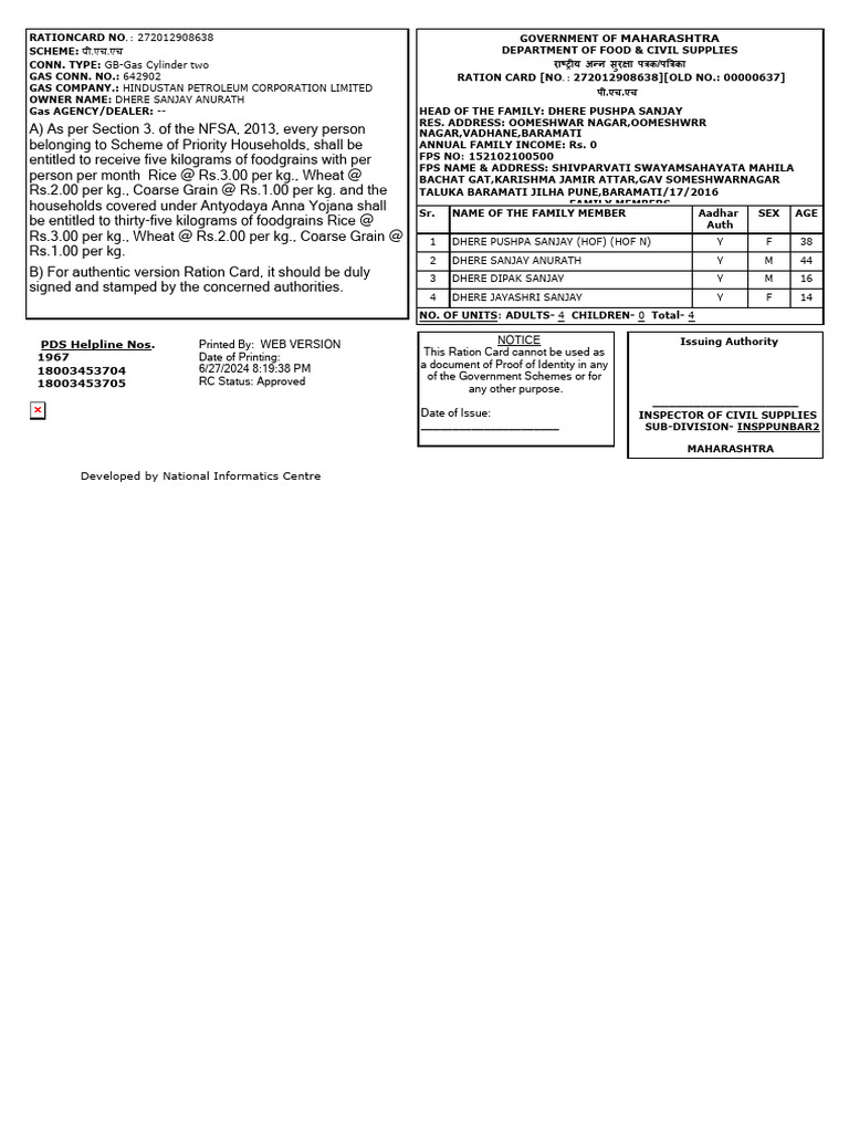 Gas AGENCY/DEALER: -- HEAD OF THE FAMILY: DHERE PUSHPA SANJAY