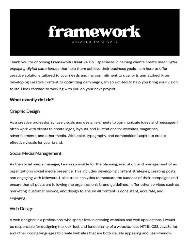 Thank you for choosing Framework Creative Co. I specialize in helping clients create meaningful,