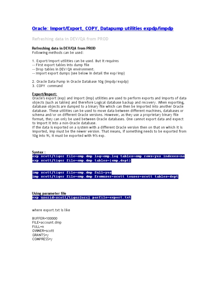 Refreshing data in DEV/QA from PROD Following methods can be used: 1. Export/Import utilities can be used. But it requires -- First export tables into dump file -- Drop tables in DEV/QA environment. -- Import export dumps (see below in detail the exp/imp) 2. Oracle Data Pump in Oracle Database 10g (impdp/expdp) 3. COPY command Export/Import: Oracle's export (exp) and import (imp) utilities are used to perform exports and imports of data objects (such as tables) and therefore Logical database backup and recovery. When exporting, database objects are dumped to a binary file which can then be imported into another Oracle database. These utilities can be used to move data between different machines, databases or schema and/or on different Oracle versions. However, as they use a proprietary binary file format, they can only be used between Oracle databases. One cannot export data and expect to import it into a non-Oracle database. If the data is exported on a system with a different Oracle version then on that on which it is imported, imp must be the newer version. That means, if something needs to be exported from 10g into 9i, it must be exported with 9i's exp.