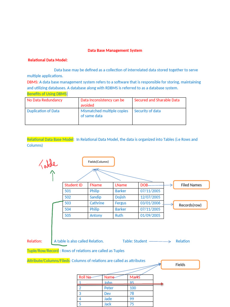 DBMS: A data base management system refers to a software that is responsible for storing, maintaining