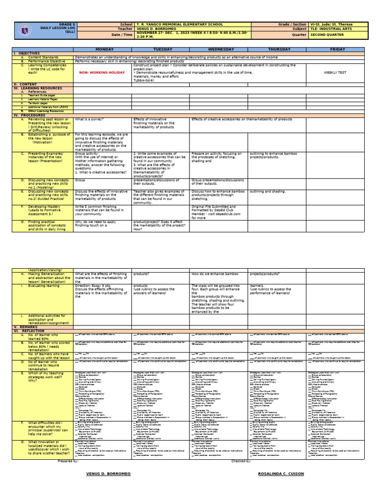DAILY LESSON LOG Teacher VENUS D. BORROMEO Subject TLE- INDUSTRIAL ARTS