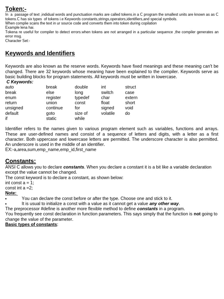 tokens.C has six types of tokens i.e Keywords constants,strings,operators,identifiers,and special symbols.