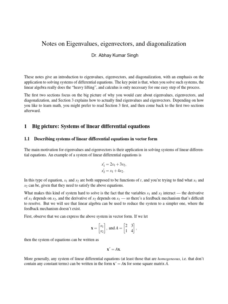 The main motivation for eigenvalues and eigenvectors is their application in solving systems of linear differen-