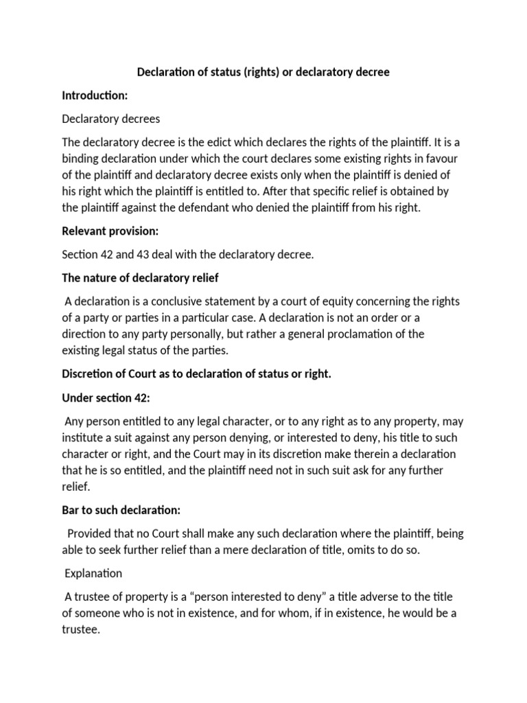 A declaration is a conclusive statement by a court of equity concerning the rights