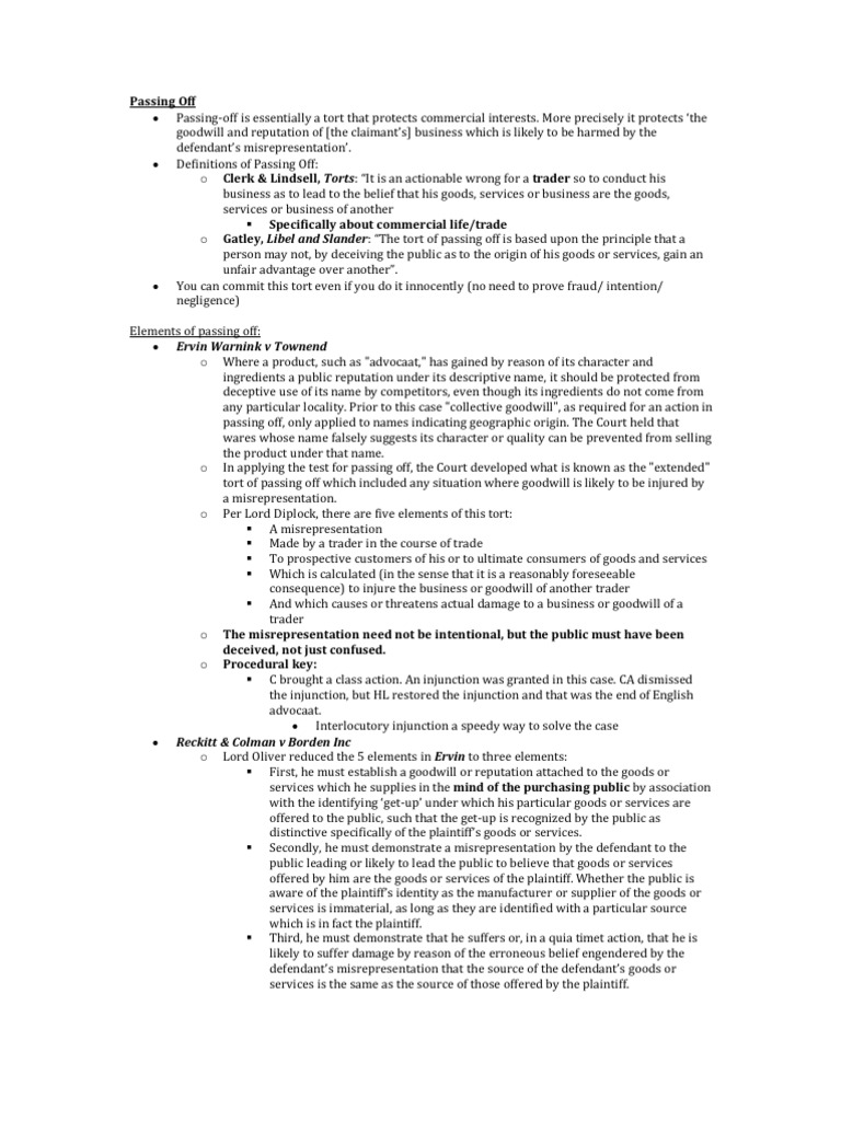 More precisely it protects the goodwill and reputation of [the claimant s] business which is likely to be harmed by the defendant s misrepresentation . y Definitions of Passing Off: o Clerk & Lindsell, Torts: It is an actionable wrong for a trader so to conduct his business as to lead to the belief that his goods, services or business are the goods, services or business of another Specifically about commercial life/trade o Gatley, Libel and Slander: The tort of passing off is based upon the principle that a person may not, by deceiving the public as to the origin of his goods or services, gain an unfair advantage over another . y You can commit this tort even if you do it innocently (no need to prove fraud/ intention/ negligence) Elements of passing off: y Ervin Warnink v Townend o Where a product, such as "advocaat," has gained by reason of its character and ingredients a public reputation under its descriptive name, it should be protected from deceptive use of its name by competitors, even though its ingredients do not come from any particular locality. Prior to this case "collective goodwill", as required for an action in passing off, only applied to names indicating geographic origin. The Court held that wares whose name falsely suggests its character or quality can be prevented from selling the product under that name. o In applying the test for passing off, the Court developed what is known as the "extended" tort of passing off which included any situation where goodwill is likely to be injured by a misrepresentation. o Per Lord Diplock, there are five elements of this tort: A misrepresentation Made by a trader in the course of trade To prospective customers of his or to ultimate consumers of goods and services Which is calculated (in the sense that it is a reasonably foreseeable consequence) to injure the business or goodwill of another trader And which causes or threatens actual damage to a business or goodwill of a trader o The misrepresentation need not be intentional, but the public must have been deceived, not just confused. o Procedural key: C brought a class action. An injunction was granted in this case. CA dismissed the injunction, but HL restored the injunction and that was the end of English advocaat. y Interlocutory injunction a speedy way to solve the case y Reckitt & Colman v Borden Inc o Lord Oliver reduced the 5 elements in Ervin to three elements: First, he must establish a goodwill or reputation attached to the goods or services which he supplies in the mind of the purchasing public by association with the identifying get-up under which his particular goods or services are offered to the public, such that the get-up is recognized by the public as distinctive specifically of the plaintiff s goods or services. Secondly, he must demonstrate a misrepresentation by the defendant to the public leading or likely to lead the public to believe that goods or services offered by him are the goods or services of the plaintiff. Whether the public is aware of the plaintiff s identity as the manufacturer or supplier of the goods or services is immaterial, as long as they are identified with a particular source which is in fact the plaintiff. Third, he must demonstrate that he suffers or, in a quia timet action, that he is likely to suffer damage by reason of the erroneous belief engendered by the defendant s misrepresentation that the source of the defendant s goods or services is the same as the source of those offered by the plaintiff.