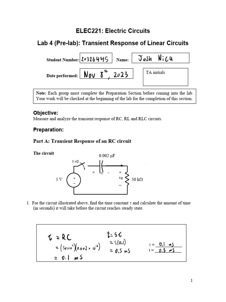 Lab 4 (Pre-lab): Transient Response of Linear Circuits