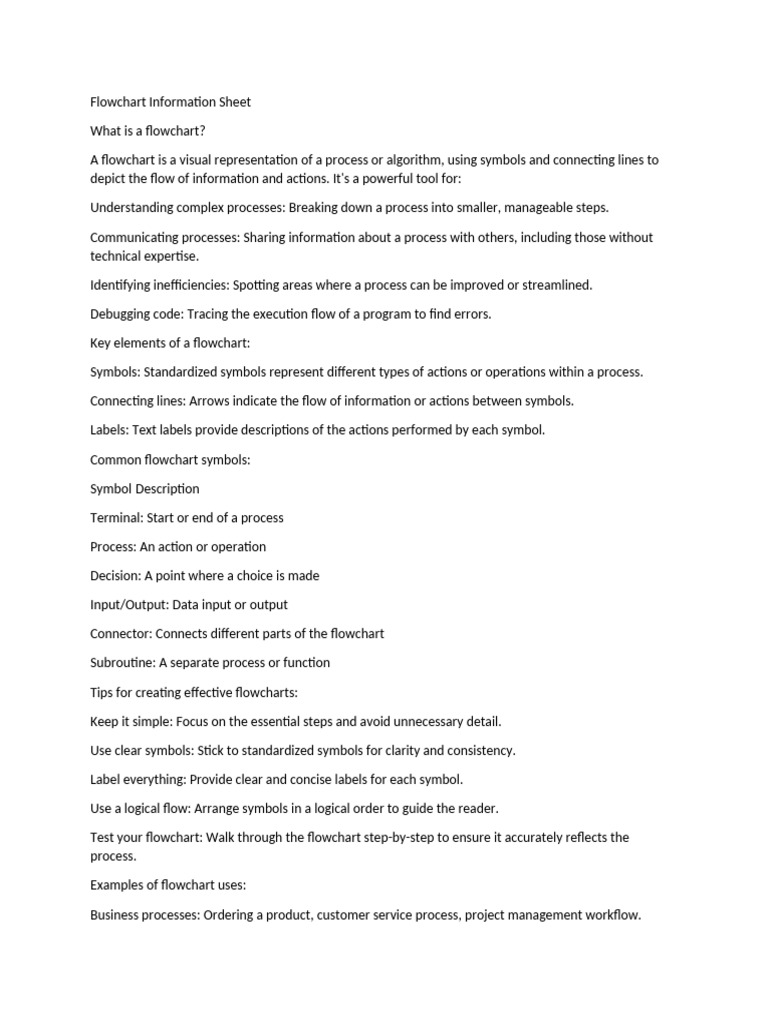 A flowchart is a visual representation of a process or algorithm, using symbols and connecting lines to