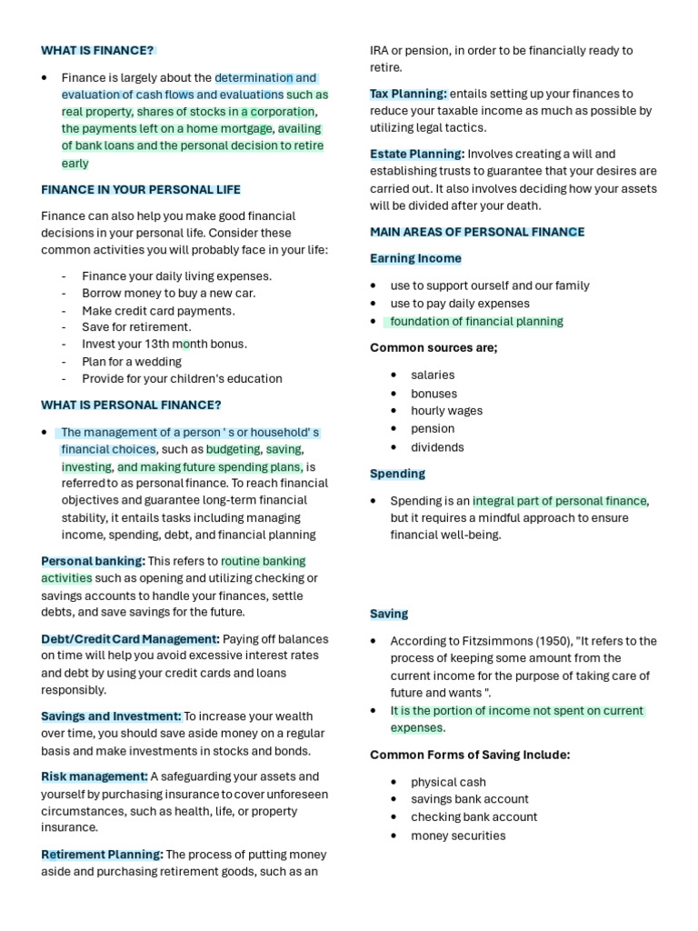 FINANCE IN YOUR PERSONAL LIFE carried out. It also involves deciding how your assets