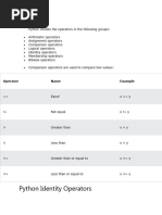 10. **Comparison Operators**: `==`, `!=`, `>`, `>=`, `<`, `<=`, `is`, `is not`, `in`, `not in`