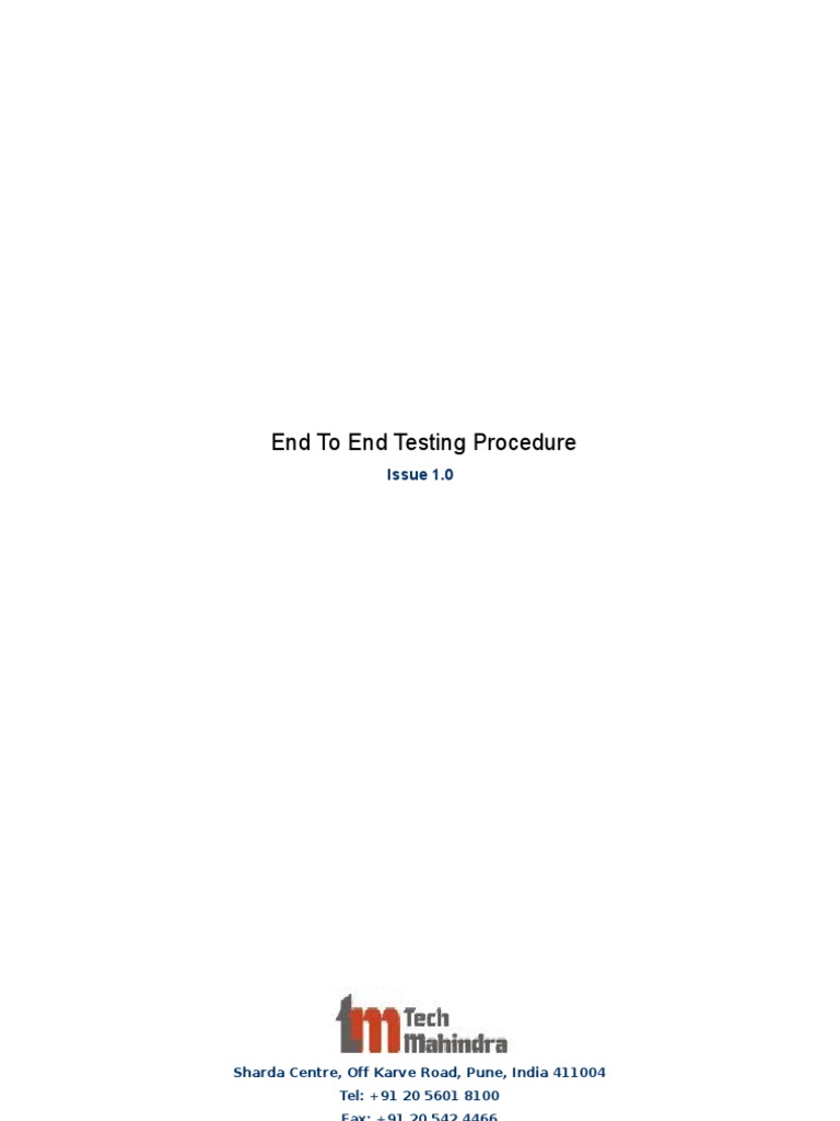 To lay down step by step procedure for End to End testing process, this will act as a reference/guide for associates. This document can also be used for training and knowledge management purpose. SCOPE This process is applicable for End to End Testing projects. It includes E2E testing both manual and automated. This process document is created with an intention of covering all types of Functional and performance End to End Testing projects. This document can be used for executing end to end testing projects both manual and automated. ACRONYMS AND DEFINITIONS Term/ acronym E2E CIT IVVT RCA PROCEDURE OVERVIEW End to End Test Execution and Defect Management Entry criteria Baseline Test plan / Test cases reviewed and approved by customer Availability of customer supplied material. Identified Hardware, Software, tools, technical material, test data are in place Exit criteria Quality Gate/Exit Criteria for CIT Acceptance of Automated test pack by customer Defects logged and reported to customer Test stop criteria met Explanation End to End Component Integration Testing Integration, Verification, Validation & Testing Root Cause Analysis