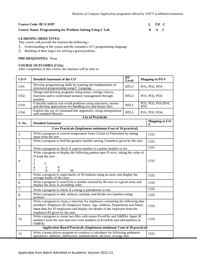 Course Name: Programming for Problem Solving Using C Lab 0 4 2