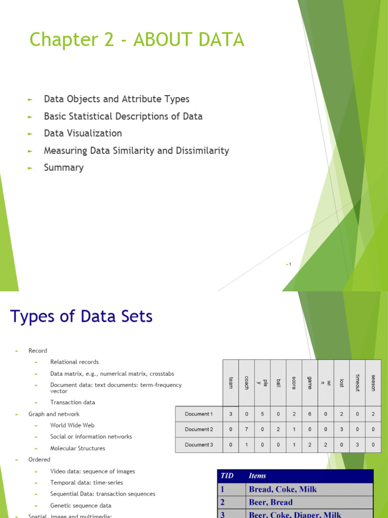 ► Many types of data sets, e.g., numerical, text, graph, Web, image.