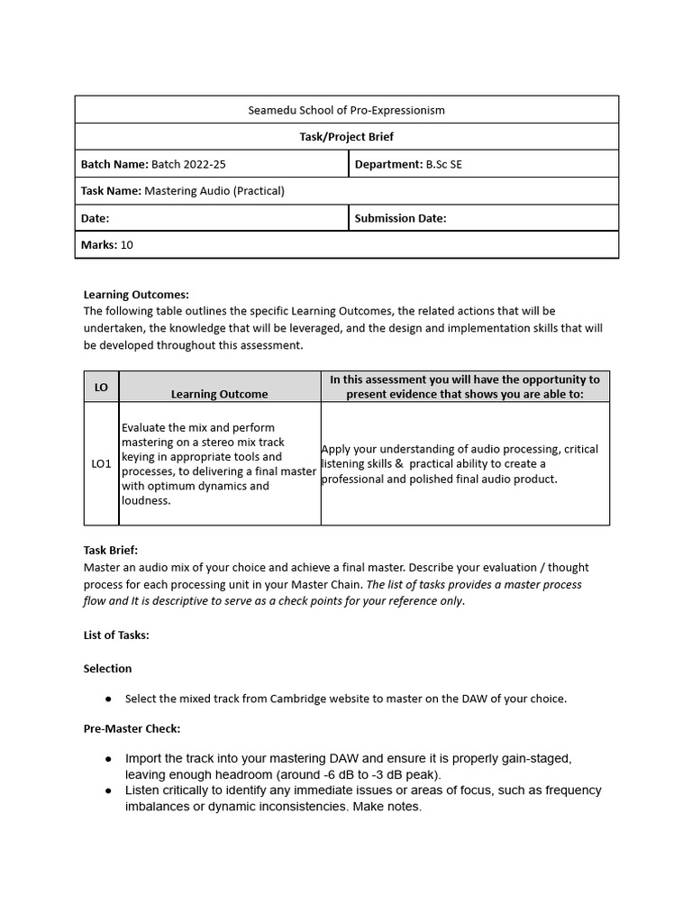 Master an audio mix of your choice and achieve a final master. Describe your evaluation / thought