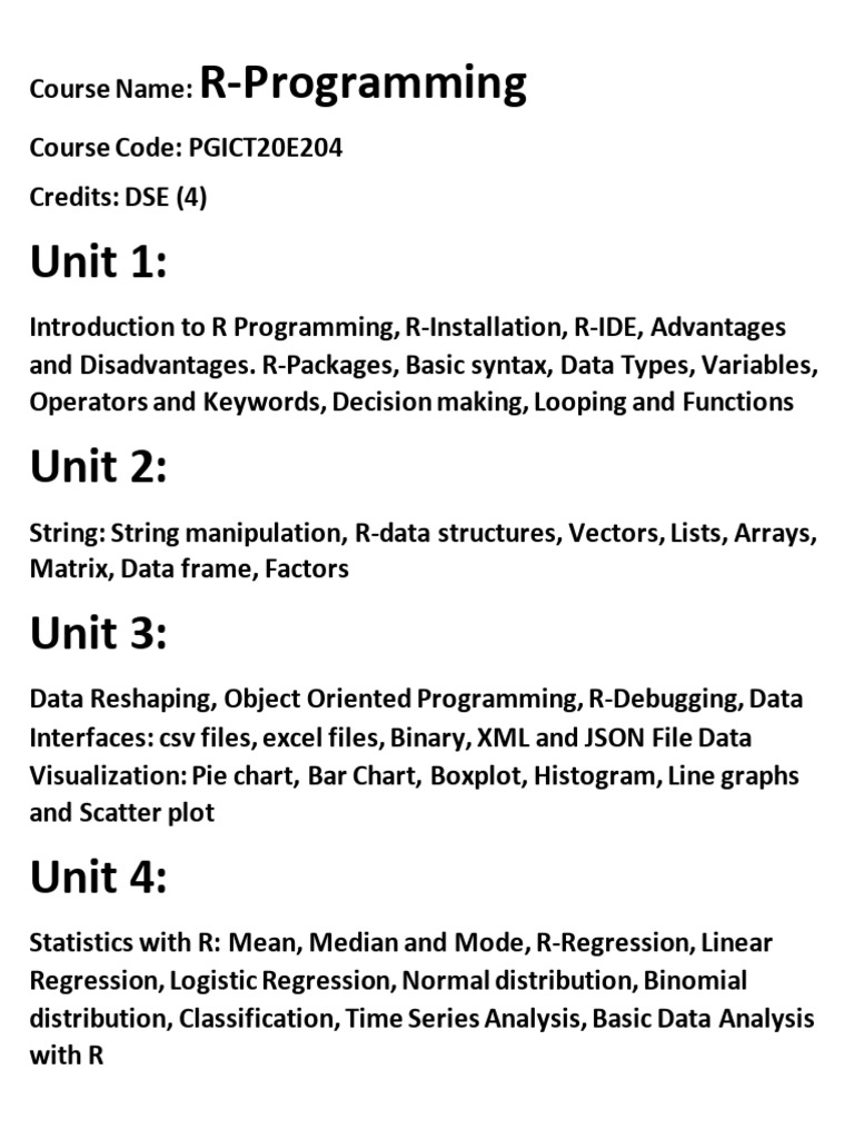 and Disadvantages. R-Packages, Basic syntax, Data Types, Variables,