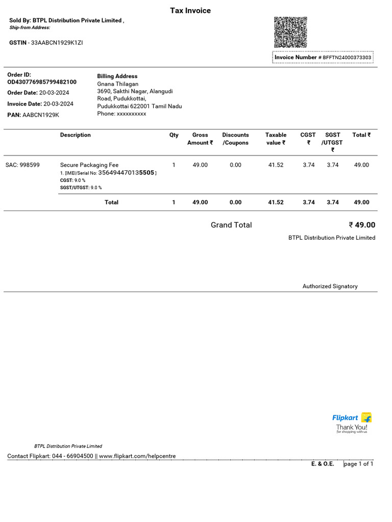 Invoice Date: 20-03-2024 Pudukkottai 622001 Tamil Nadu Pudukkottai 622001 Tamil Nadu warranty purposes.