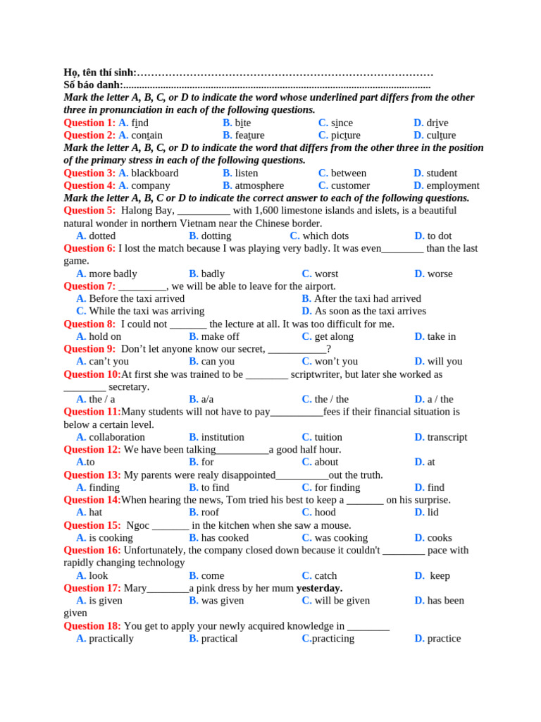 Mark the letter A, B, C or D to indicate the correct answer to each of the following questions.
