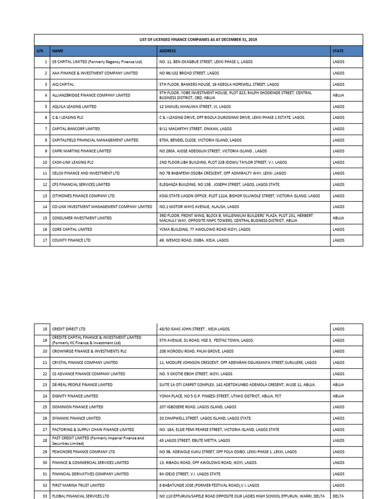 LIST OF LICENSED FINANCE COMPANIES AS AT DECEMBER 31, 2019