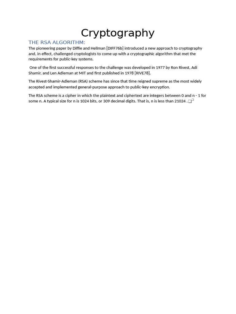 The RSA scheme is a cipher in which the plaintext and ciphertext are integers between 0 and n - 1 for