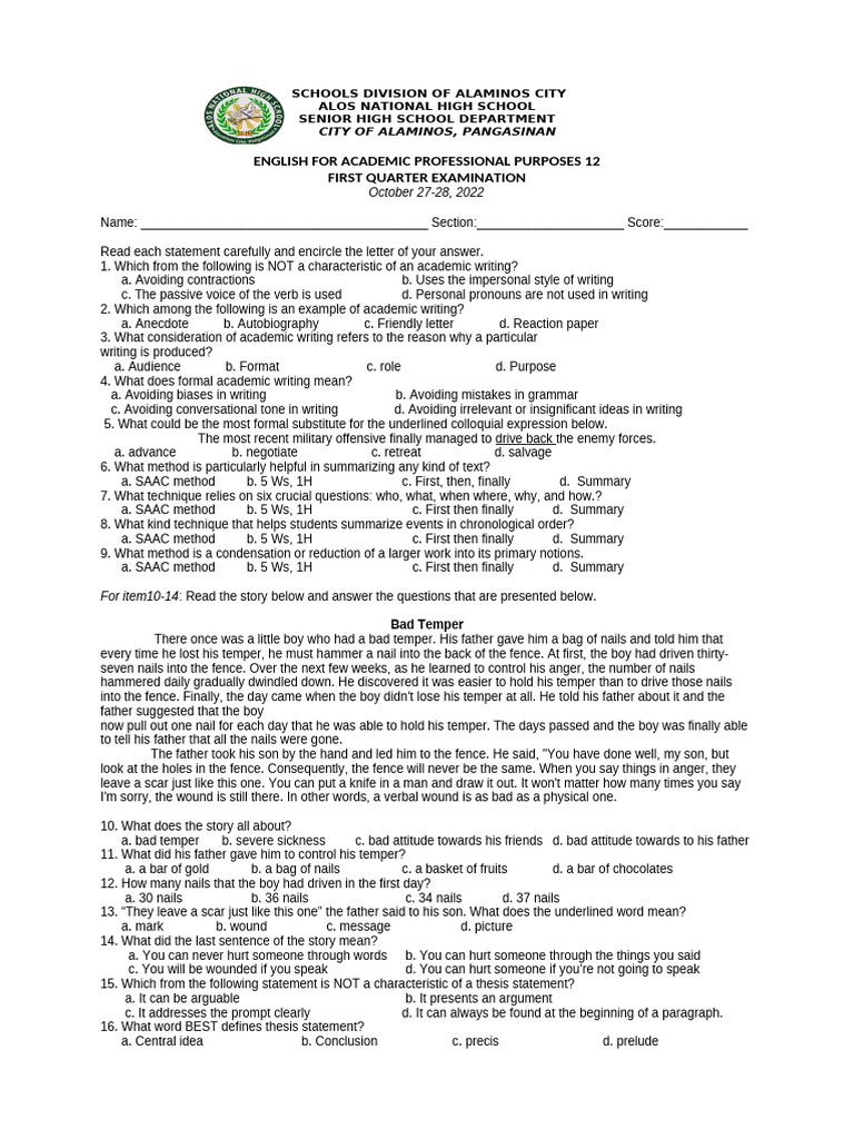 a. Anecdote b. Autobiography c. Friendly letter d. Reaction paper