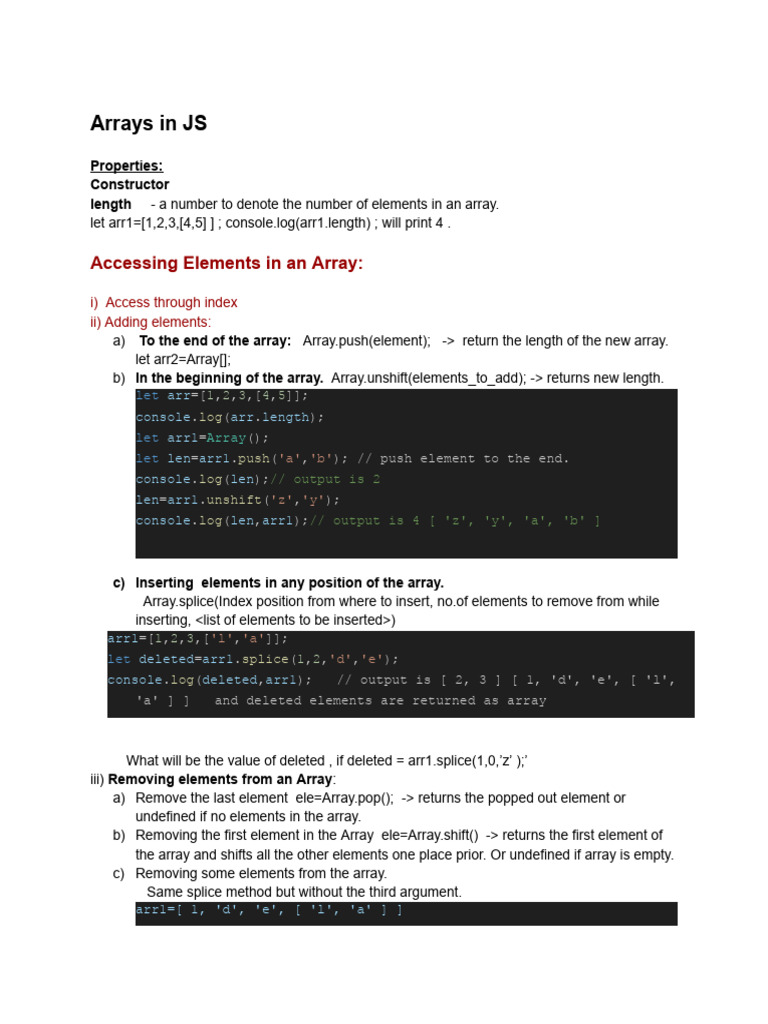 b) Removing the first element in the Array ele=Array.shift() -> returns the first element of