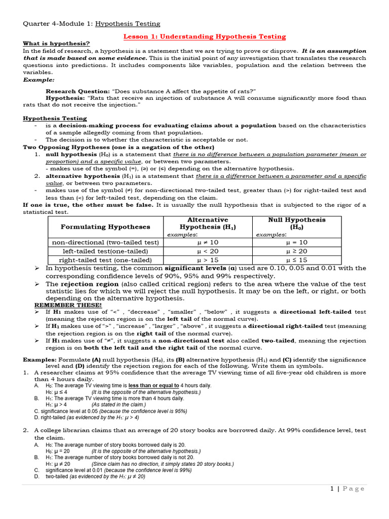 Directions: Formulate (A) alternative hypothesis (H1) and its (B) null hypothesis (H0), (C) identify the significance level and (D) identify